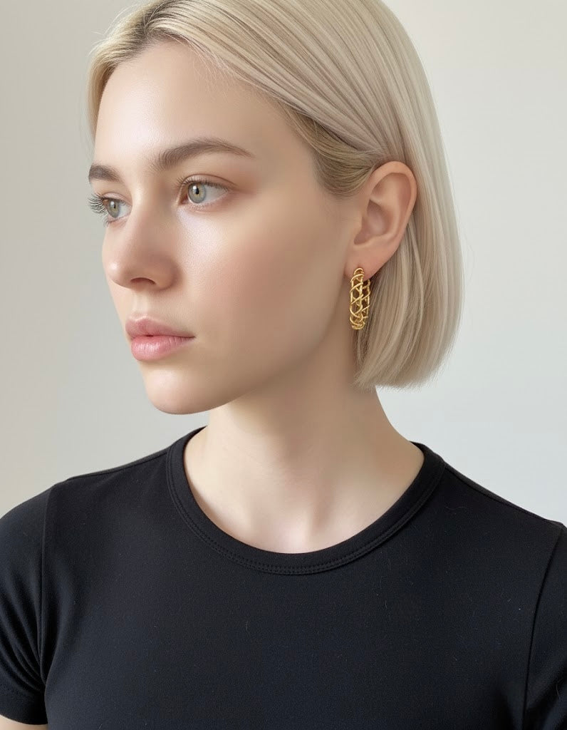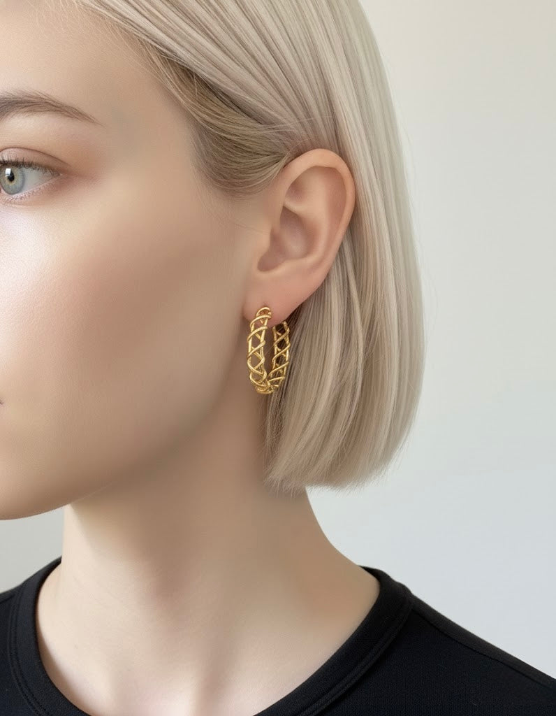 Diese auffälligen Creolen aus 316L Edelstahl, vergoldet in 18 Karat Gold, sind ein Statement-Piece für jeden Look. Das einzigartige, geflochtene Design verleiht den Creolen einen modernen Touch.